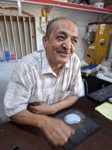 Un poco más adelante se encuentra la fábrica de zapatos de Abu Ashraf, en un edificio en el que también viven sus cinco hijes y sus familias. Pregunté por el recién nacido que hace dos años tenía problemas pulmonares debido a la exposición diaria al gas lacrimógeno y – recibiendo buenas noticias – me mostraron una foto de un niño pequeño guapo y radiante, ahora ya recuperado, y de su hermanita. Vimos a muches niñes (al parecer hay 40 nietes) que sentían emoción por la visita y charlaban alegremente. Pero Abu Ashraf nos contó que, diez días antes, les niñes estaban jugando fuera y, cuando gritaron “¡personas soldado!” y corrieron hacia sus casas, las personas soldado dispararon munición real por la calle.