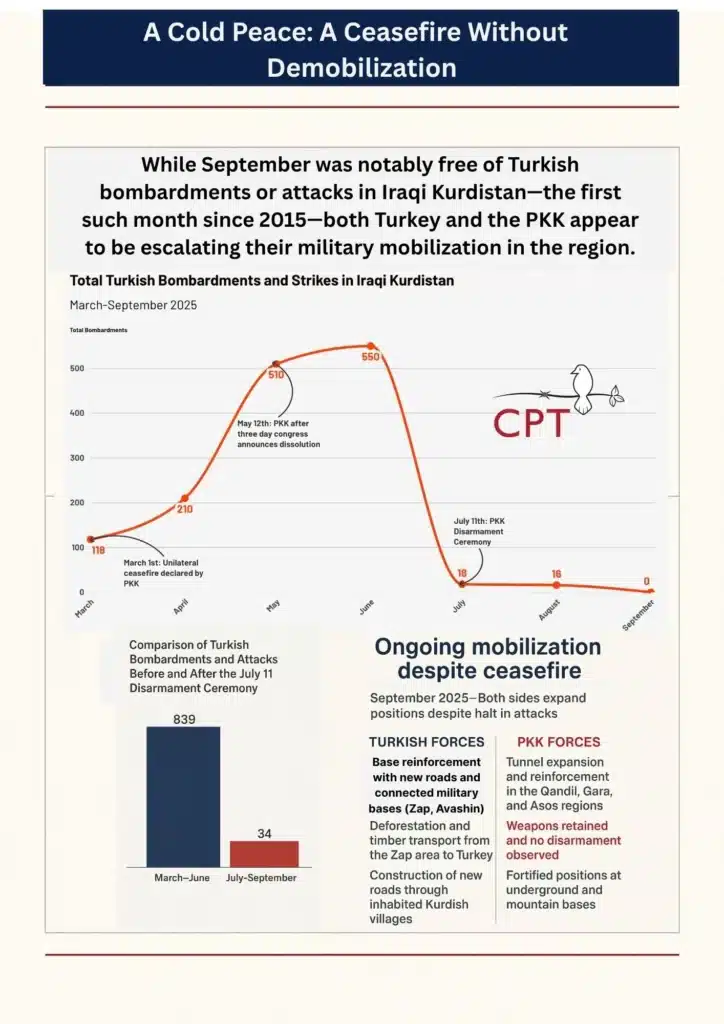 Han pasado siete meses desde que el Partido de los Trabajadores del Kurdistán (PKK) anunciara un alto el fuego unilateral y más de tres meses desde que celebrara una ceremonia simbólica para iniciar el proceso de desarme. Ahora que las negociaciones de paz y los esfuerzos de implementación están entrando en fases más profundas de discusión. Septiembre ha sido el primer mes desde el último proceso de paz en el 2015 sin bombardeos ni ataques por parte de las Fuerzas Armadas Turcas en el Kurdistán Iraquí—continuando la marcada tendencia a la baja observada en julio y agosto, en los que se registró una reducción del 97 % en los ataques. A pesar de estos avances, y aunque los bombardeos y los ataques han disminuido significativamente, la movilización militar de ambas partes ha seguido aumentando.